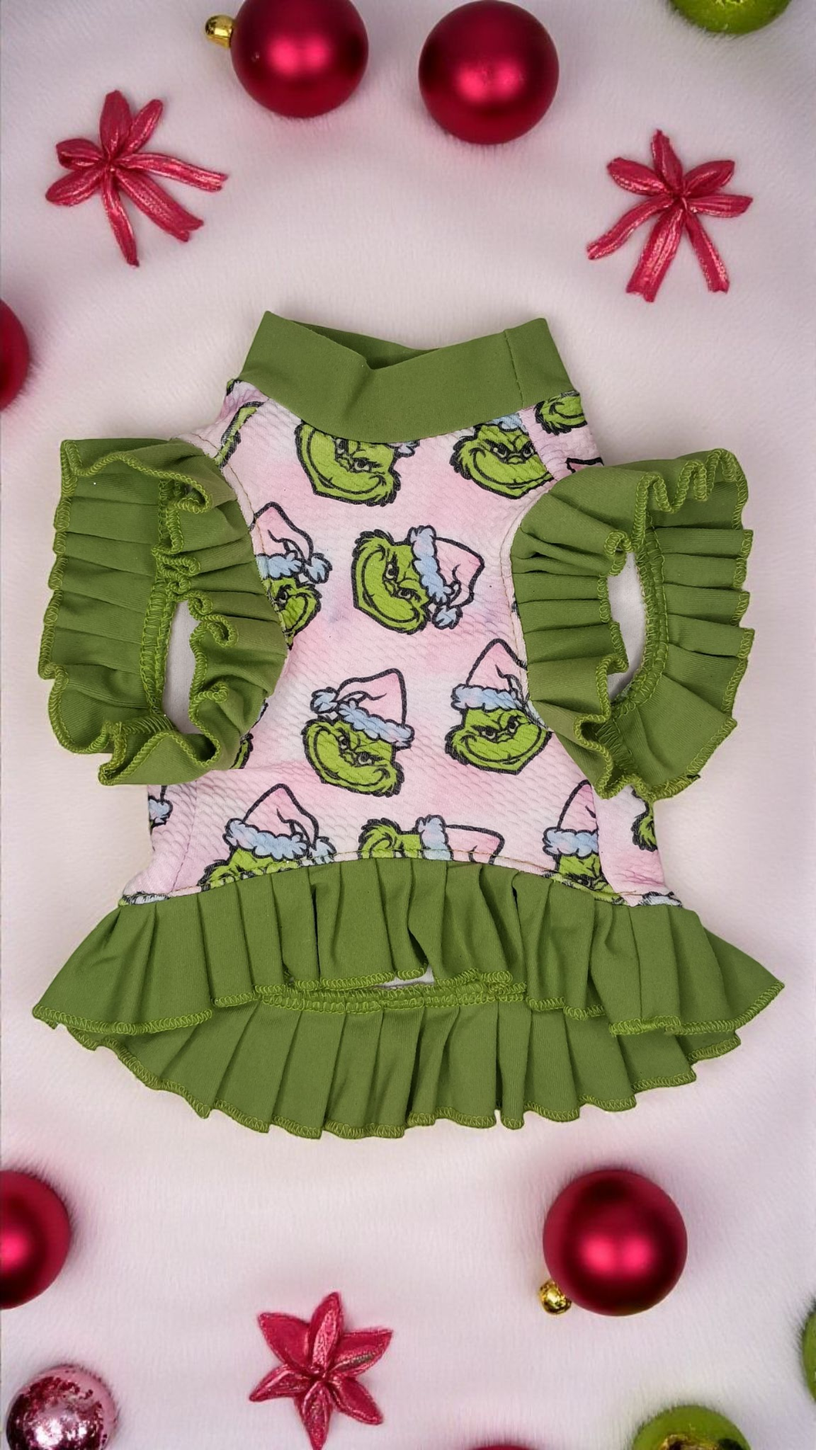 Dog Christmas shirt, cat festive shirt. fabric with a pattern of Grinch faces wearing Santa hats. It has short, ruffled sleeves and a ruffled skirt in a solid color, matching the collar and trim.