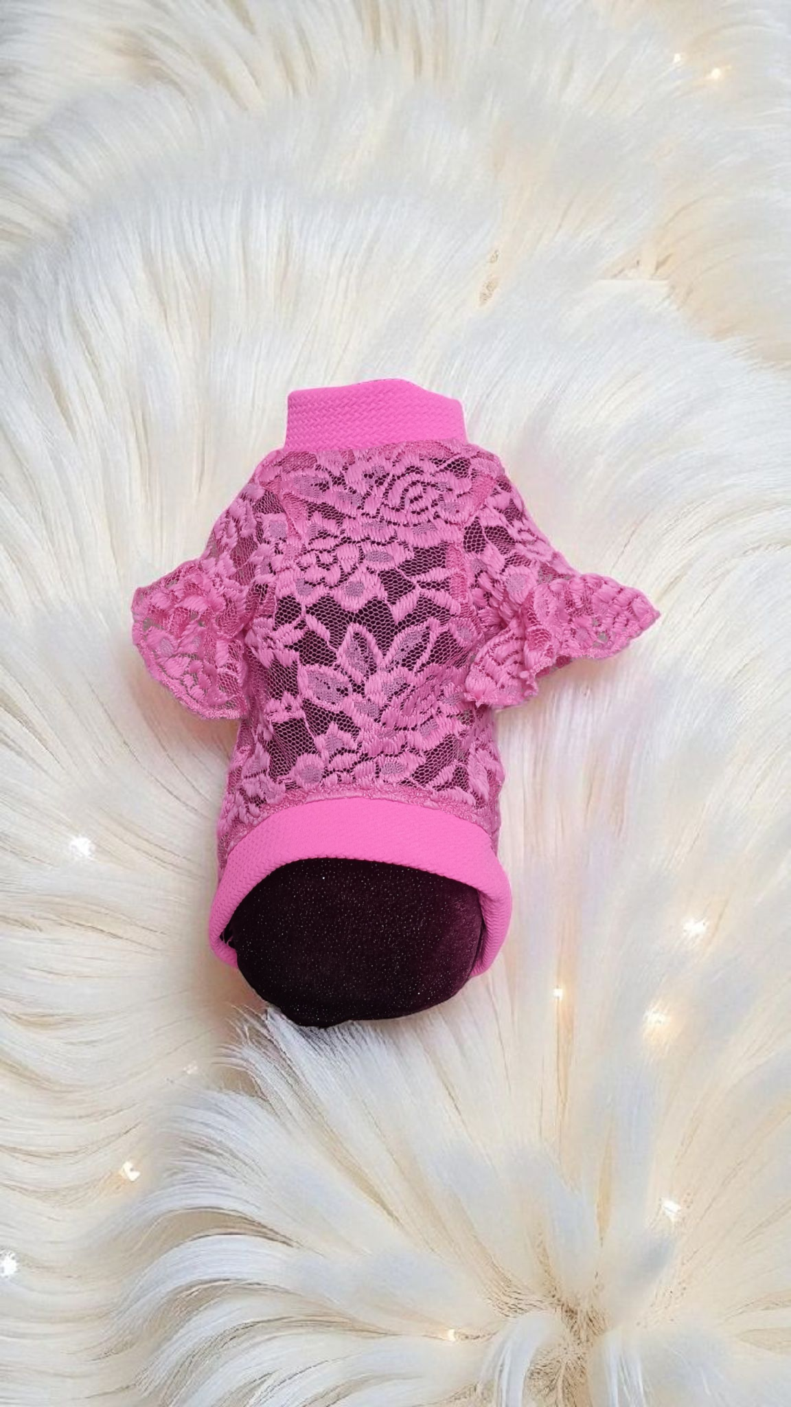Hot pink dog lace shirt.The lace features a floral leafy pattern. The sleeves are short and ruffled. Mock-neck style, solid pink trim at the bottom hem and collar.