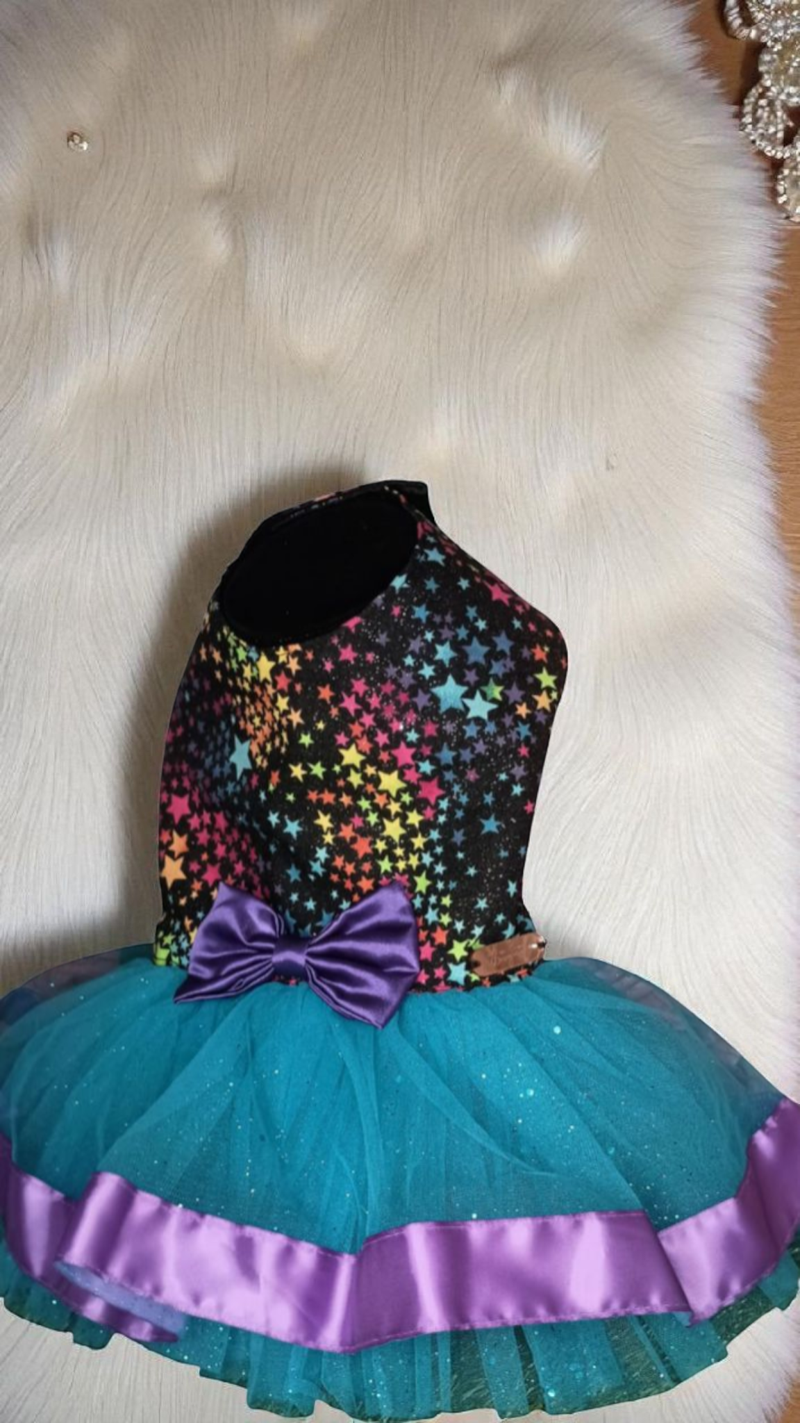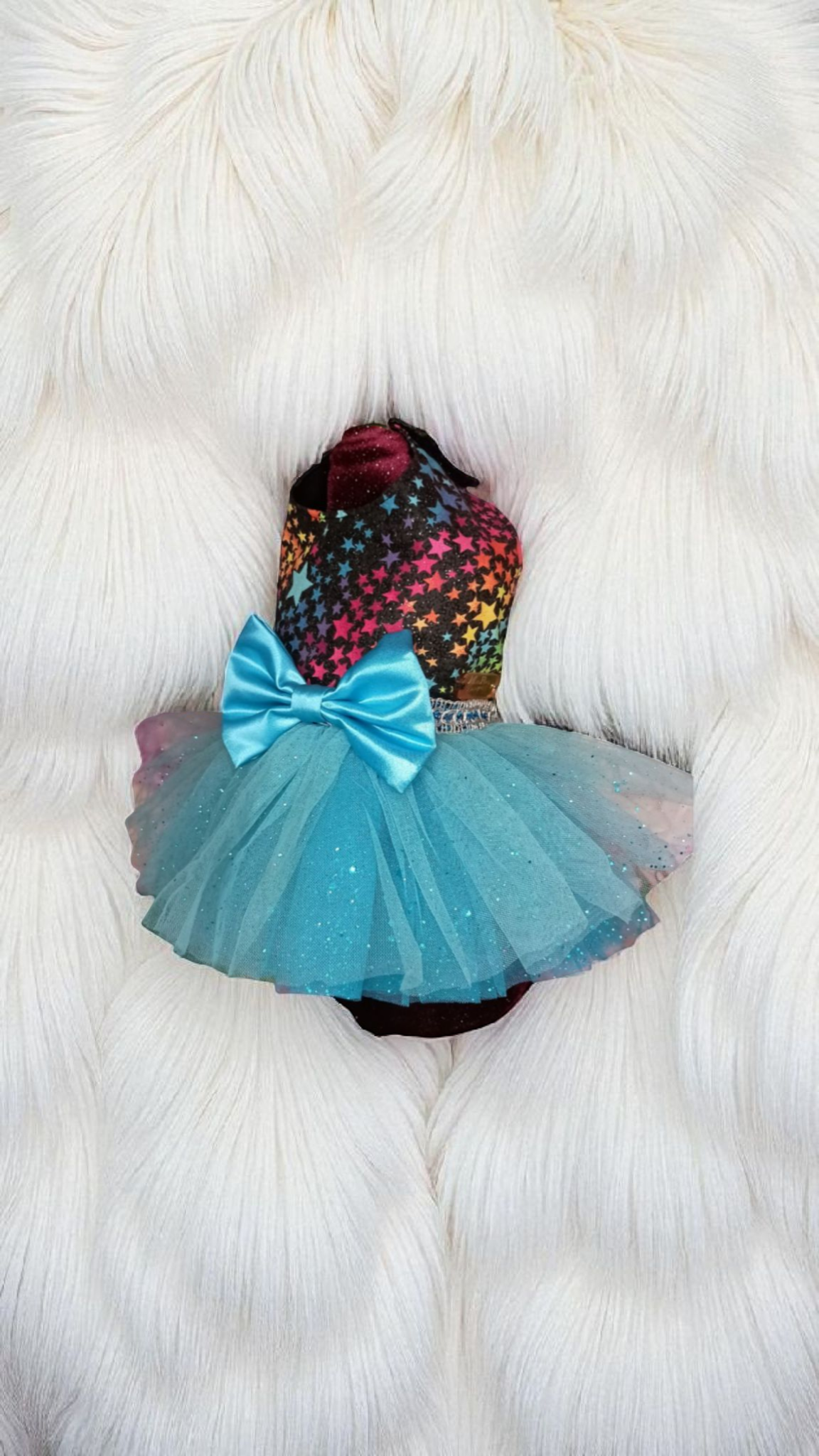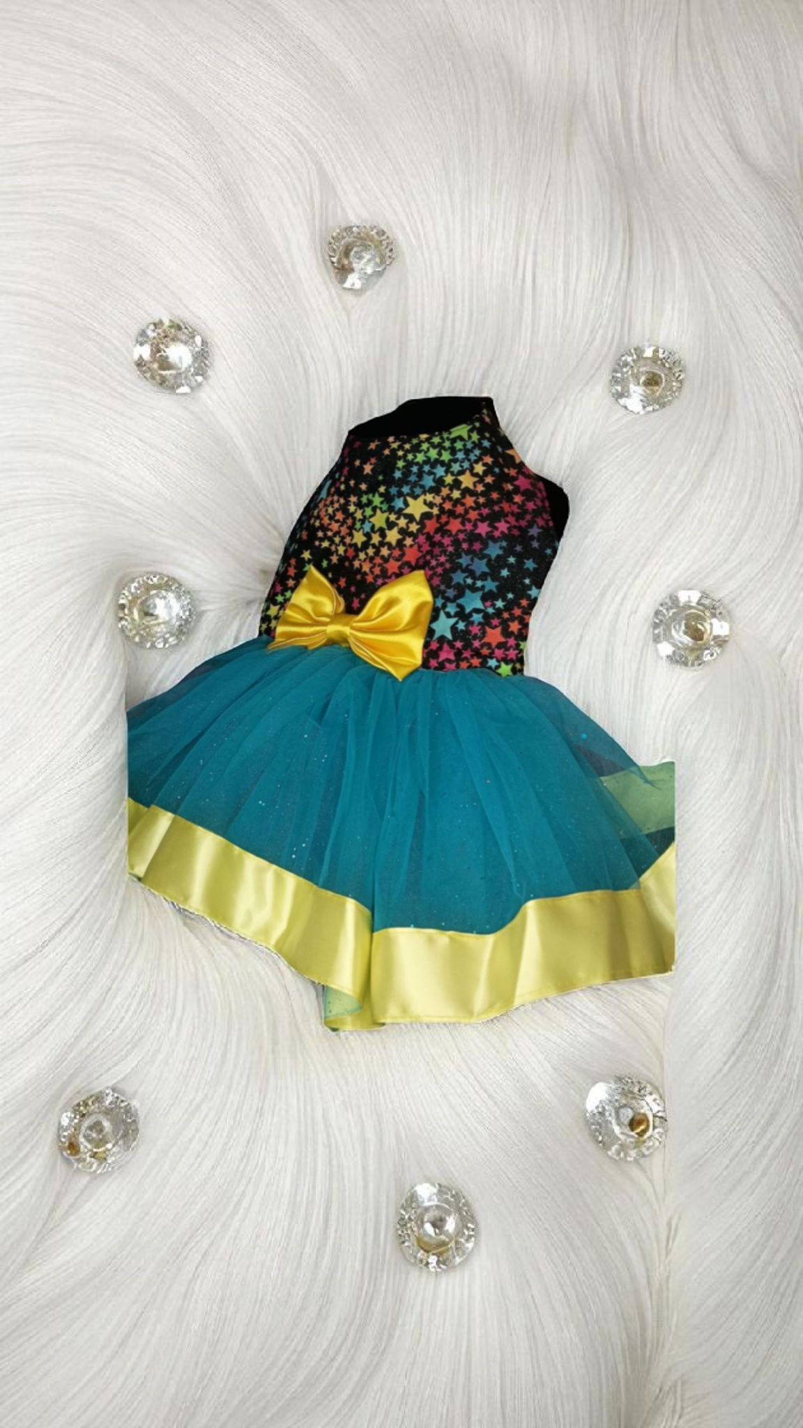 This dog dress is a vibrant and playful piece. The bodice is black, adorned with a colorful star pattern that creates a whimsical, night-sky effect. A large, golden yellow bow is centrally placed on the bodice, adding a focal point of brightness and charm. The skirt is made of a teal tulle fabric, giving it a voluminous and airy appearance. The hem of the skirt is embellished with a wide, golden yellow ribbon, which complements the bow and adds a touch of elegance to the design. Overall, the dress is eye-catching and festive, perfect for special occasions or playful outings.