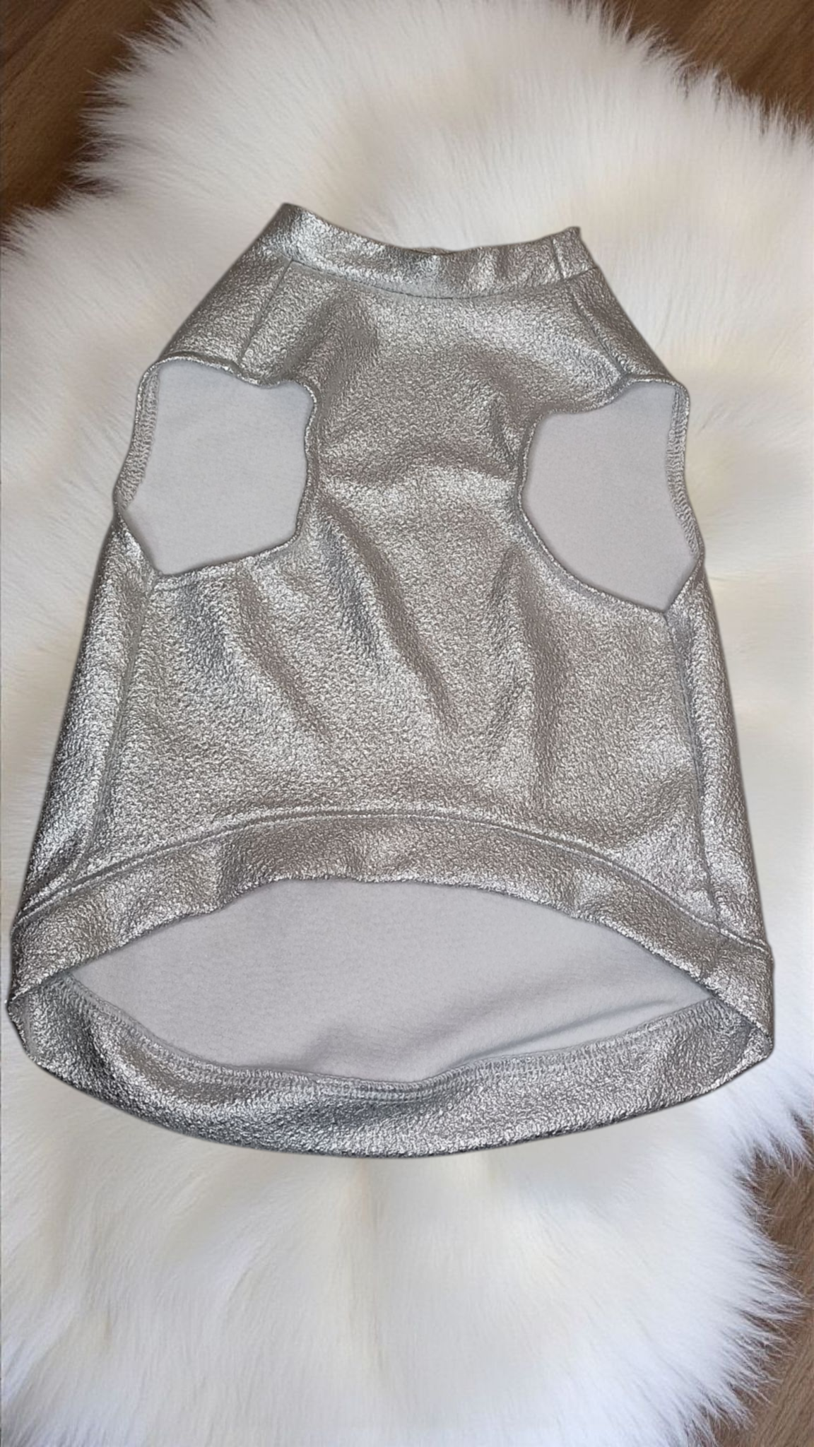 silver, metallic pet Shirt. shiny, textured silver finish, giving it a metallic, crinkled foil appearance, soft and extremely stretchable.