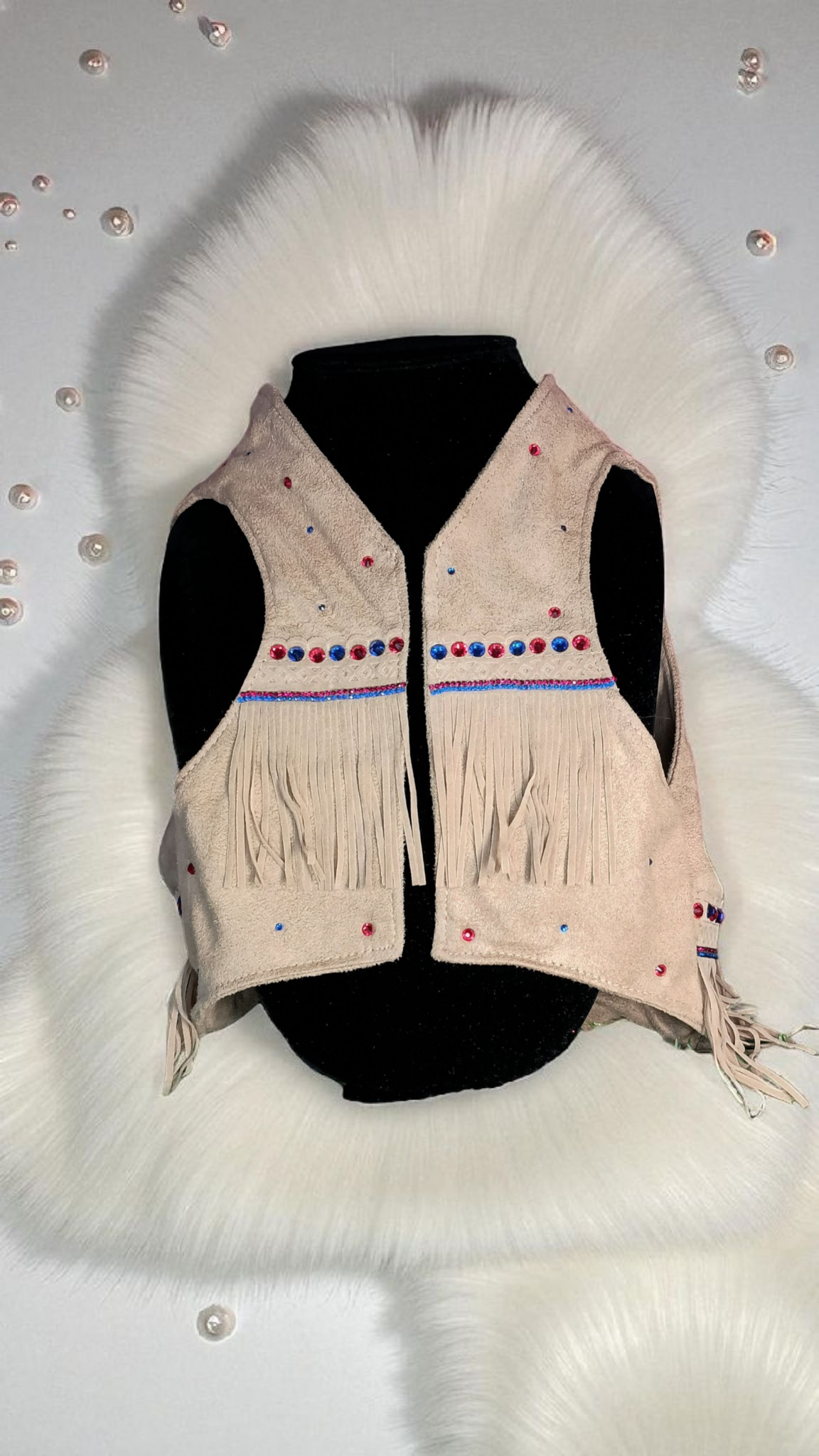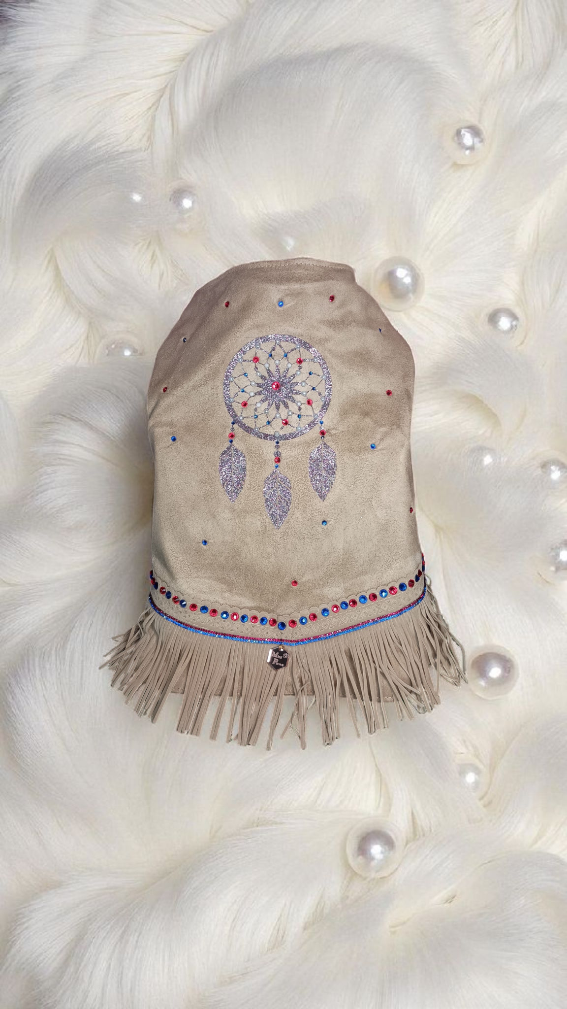 Western Outfit for Dogs, Boho vest for pets. Gorgeous, lightweight, fashionable. Boho Designed with faux suede giving it a soft texture. The back of the vest features an embroidered dreamcatcher design with colorful accents, including blue, red, and silver, and small rhinestones for added sparkle. The bottom edge of the vest is adorned with a layer of matching light tan fringe, adding a bohemian or Western-inspired touch. Above the fringe, there is a band of colorful embellishments, including small red and blue beads or stones, and a thin blue trim line, further enhancing the decorative appeal.
