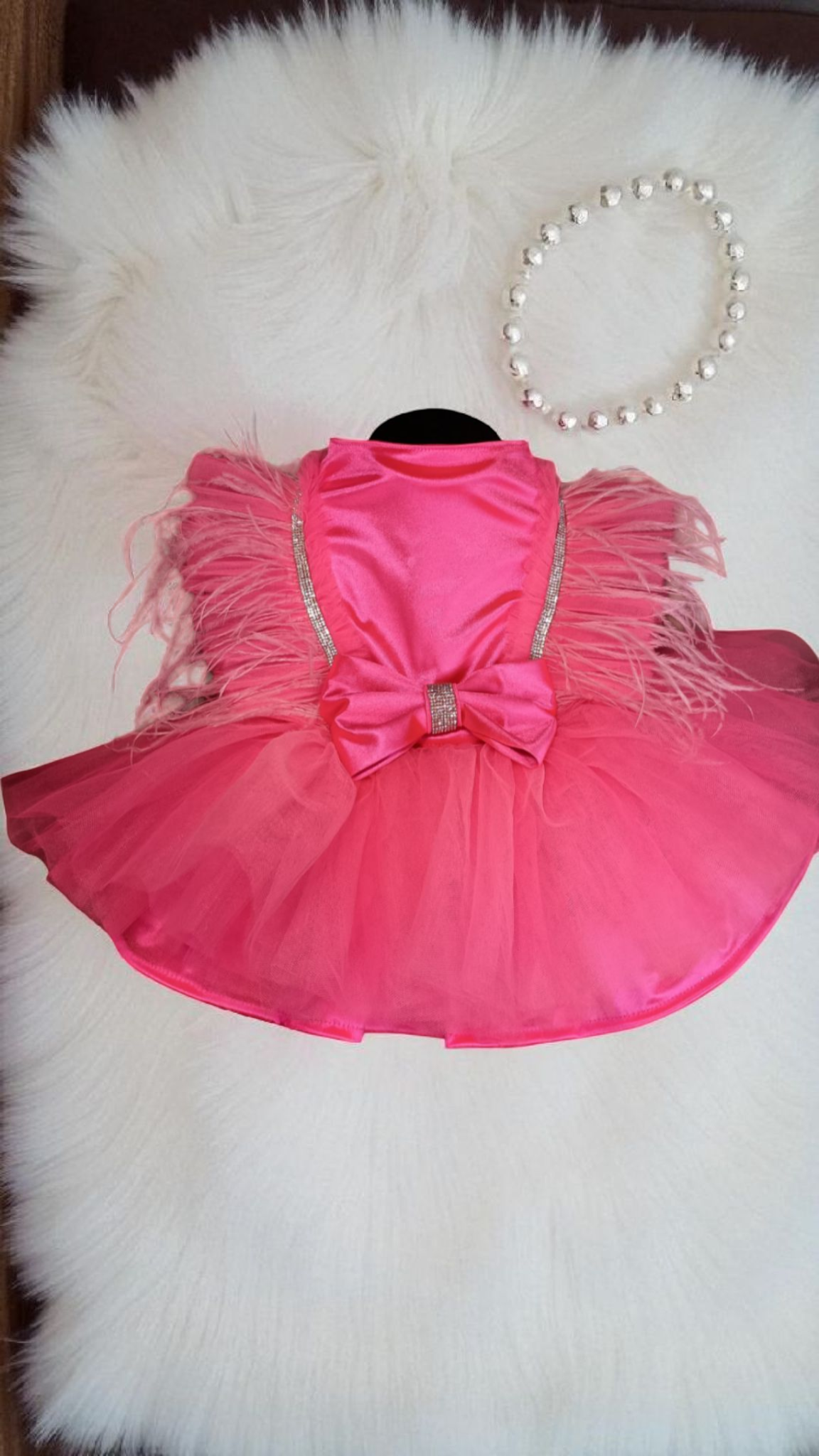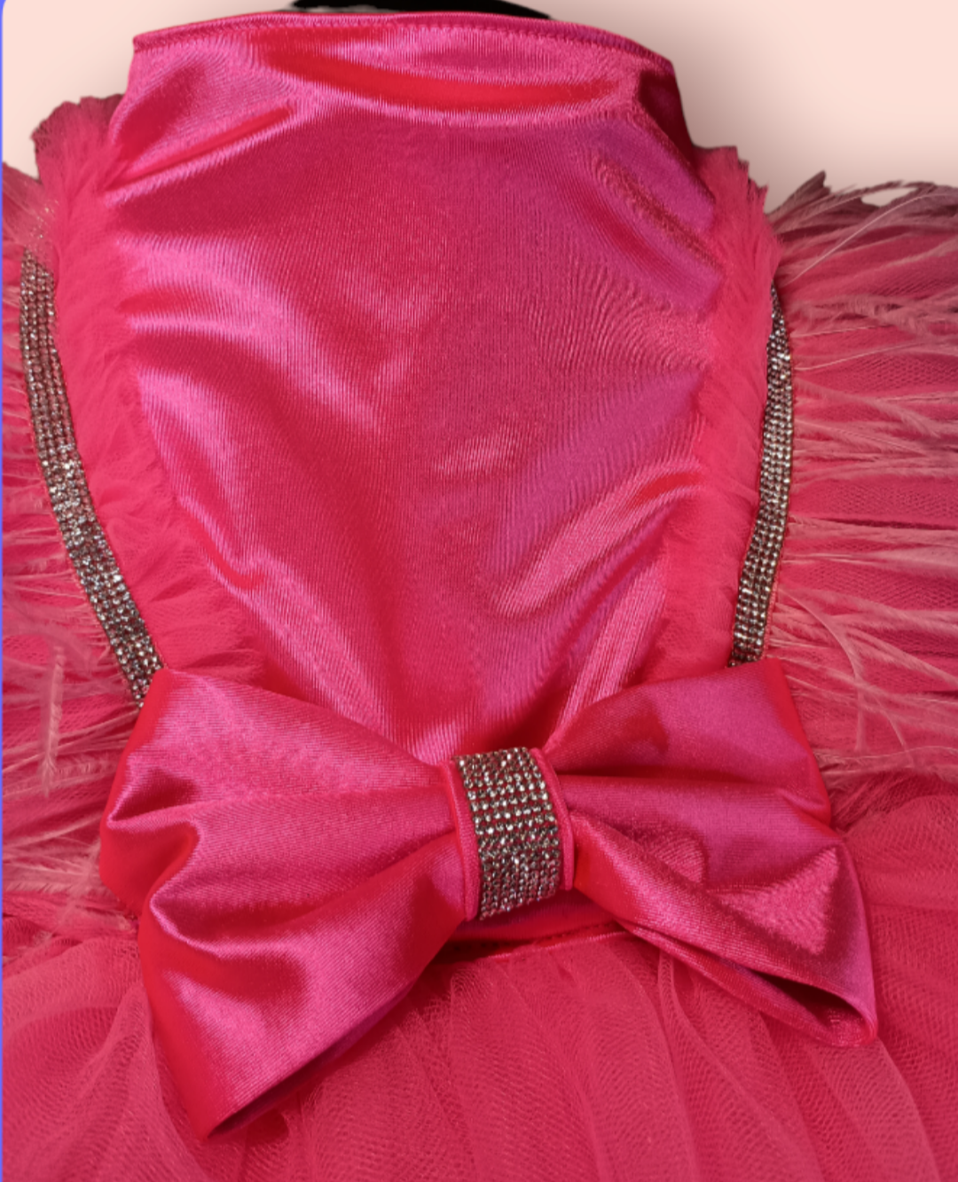 Neon pink dog dress, primarily made of a satin-like material for the bodice and a soft, voluminous tulle for the skirt, creating a tutu-like effect. Large bow at the waist, adorned with rhinestones. The shoulders are dramatically accented with a layer of ruffles and fluffy pink feathers, adding a glamorous touch. The skirt is full and puffy, with soft ruffles to enhance its volume. In addition to the rhinestones on the bow, there are also sparkling rhinestone trim running along the straps, complementing the feathers.